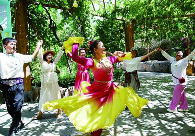 游客在葡萄沟景区与演员互动。刘健摄/光明图片